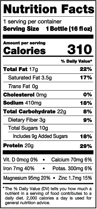 Ingredients: Cashew Milk* (Filtered Water, Cashews*), Vanilla Protein Blend* (Pea Protein*, Brown Rice Protein*, Vanilla Flavor*, SeaSalt, Guar Gum*, Stevia Extract*, Sprouted Quinoa Powder*, Chia Seed*, Sprouted Amaranth Powder*), Date Syrup*, Matcha Powder*, Vanilla Extract*, E3Live* (Aphanizomenon Flos-aquae* [blue green algae]), Himalayan Pink Salt, Greens Blend Powder* (Alfalfa Powder*, Barley Grass Powder*, Oat Grass Powder*, Spirulina Powder*, Wheat Grass Powder*), Monk Fruit Extract*